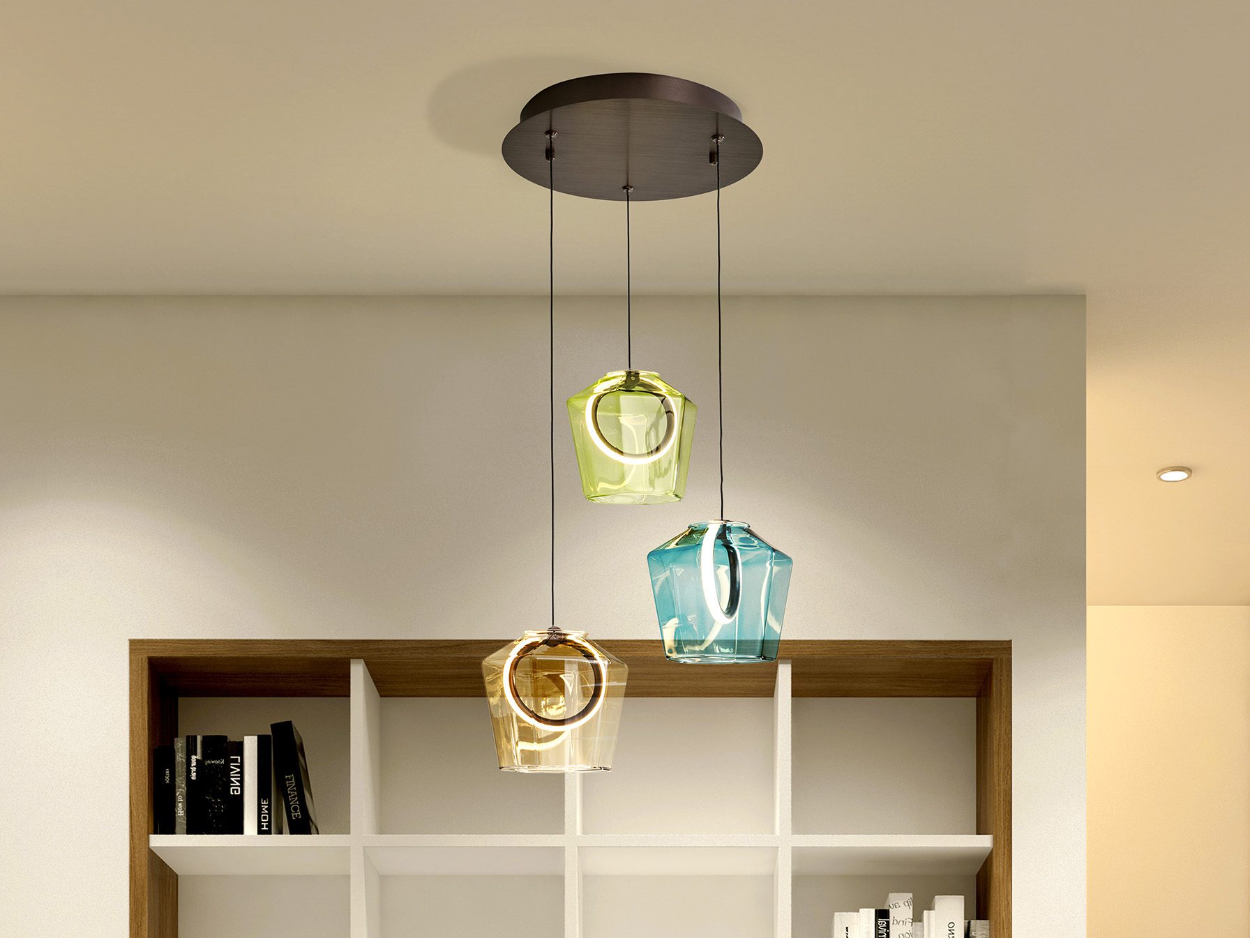 Lamp of 3 lights, made of brushed aluminium finished in a dark bronze tone. Tinted glass shades in champagne, green and blue tonalities, with inner LED light ring and silicone diffuser. 18W LED, 483 lm, 3000K