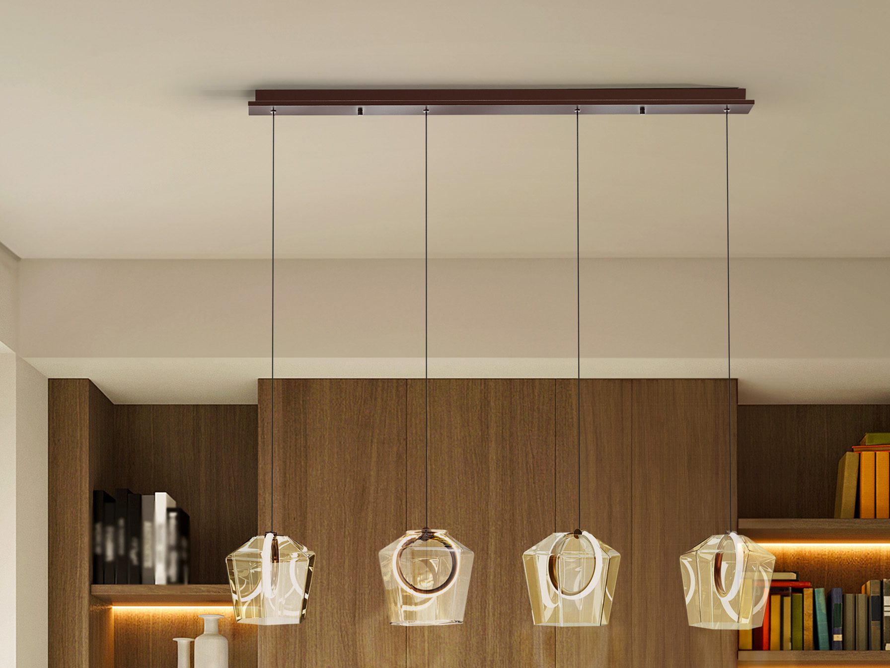 Lamp of 4 lights made of brushed aluminium finished in dark bronze tone. Tinted glass shades in champagne tonality with an inner LED light ring and silicone diffuser. 24W LED, 644 lm, 3000K
