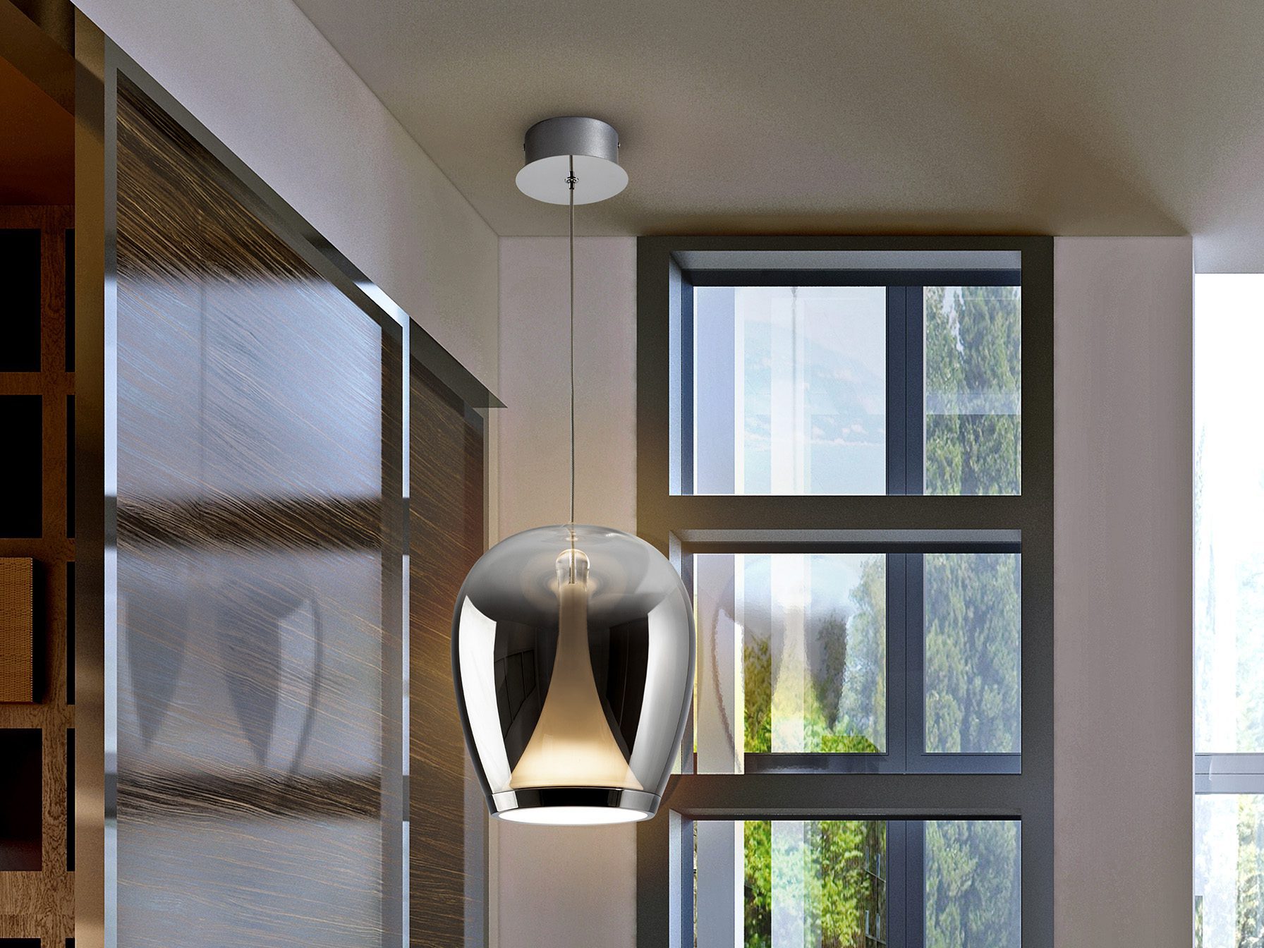 Lamp made of chromed aluminum, with blown glass shade in gradient smoke finish and opal internal diffuser. Adjustable in height. 20W LED, 1200 lm, 3000 K.